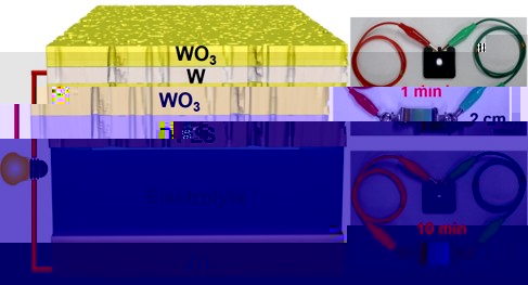 電緻變色電池作為融合電緻變色與電化學儲能功能的新型多功能器件,因其剩餘能量可視化、能量回收利用與低功耗變色等優勢,近年來受到廣泛關注。然而,當前主流的電緻變色材料難以兼顧高容量儲能與多色調控之間的性能平衡,不能滿足多彩顯示與高能量密度兼備的應用需求。本研究提出了一種“反置型”法布裡-珀羅腔結構的多彩電緻變色電池,創新性地将電緻變色功能與結構色調控、儲能能力三者集成。該器件采用具有多孔結構的聚醚砜(PES)濾膜作為柔性工作電極支撐基底,在其正面構建W/WO3疊層結構以形成高質量結構色法布裡-珀羅諧振腔,同時将電解質與對電極布置于濾膜背面,顯著減少了入射光在傳播過程中的能量損耗,提升了顔色飽和度與顯示純度。更進一步,通過在濾膜與鎢反射層之間引入額外的WO3層,在不影響結構色呈現的前提下提升了活性材料負載量,從而增強了器件的儲能能力。實驗結果表明,該反置型結構可實現多彩可調的顔色顯示,并在0.5 mA cm−2電流密度下展現出高達534.3 mAh m−2的放電容量。本工作為高性能、多功能一體化的多彩電緻變色電池設計提供了新的結構構建策略與技術路徑,具有重要的研究意義與應用潛力。